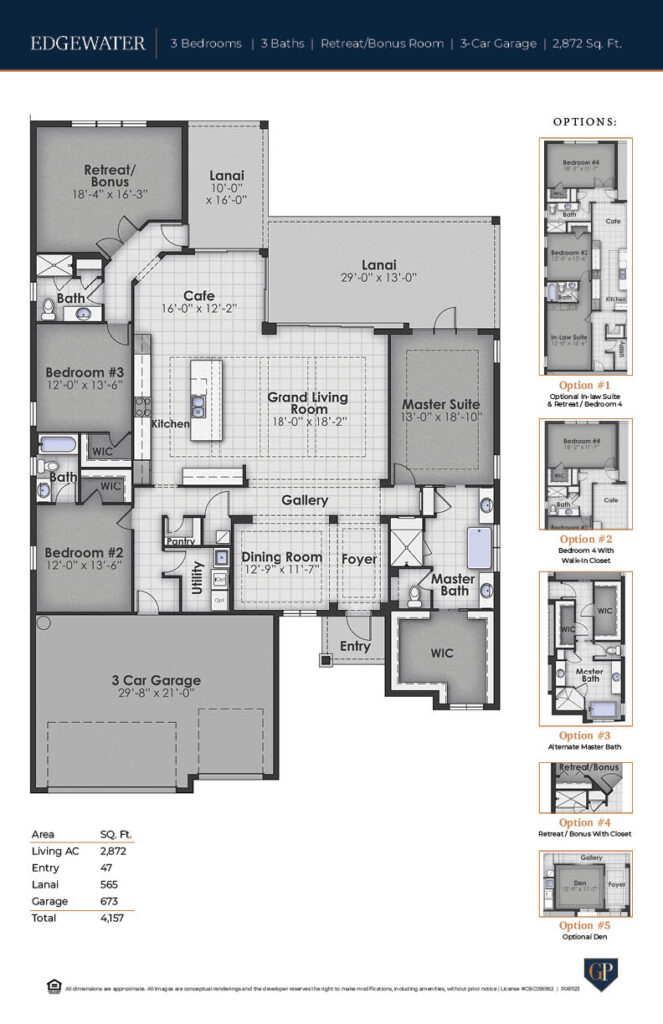 A true reflection of elegant Florida living, the Edgewater combines sophistication and comfort in every detail. This spacious residence features three bedrooms, three baths, bonus room and a three-car garage. Thoughtfully designed for modern lifestyles, the Edgewater seamlessly blends style, function and the warmth of home.